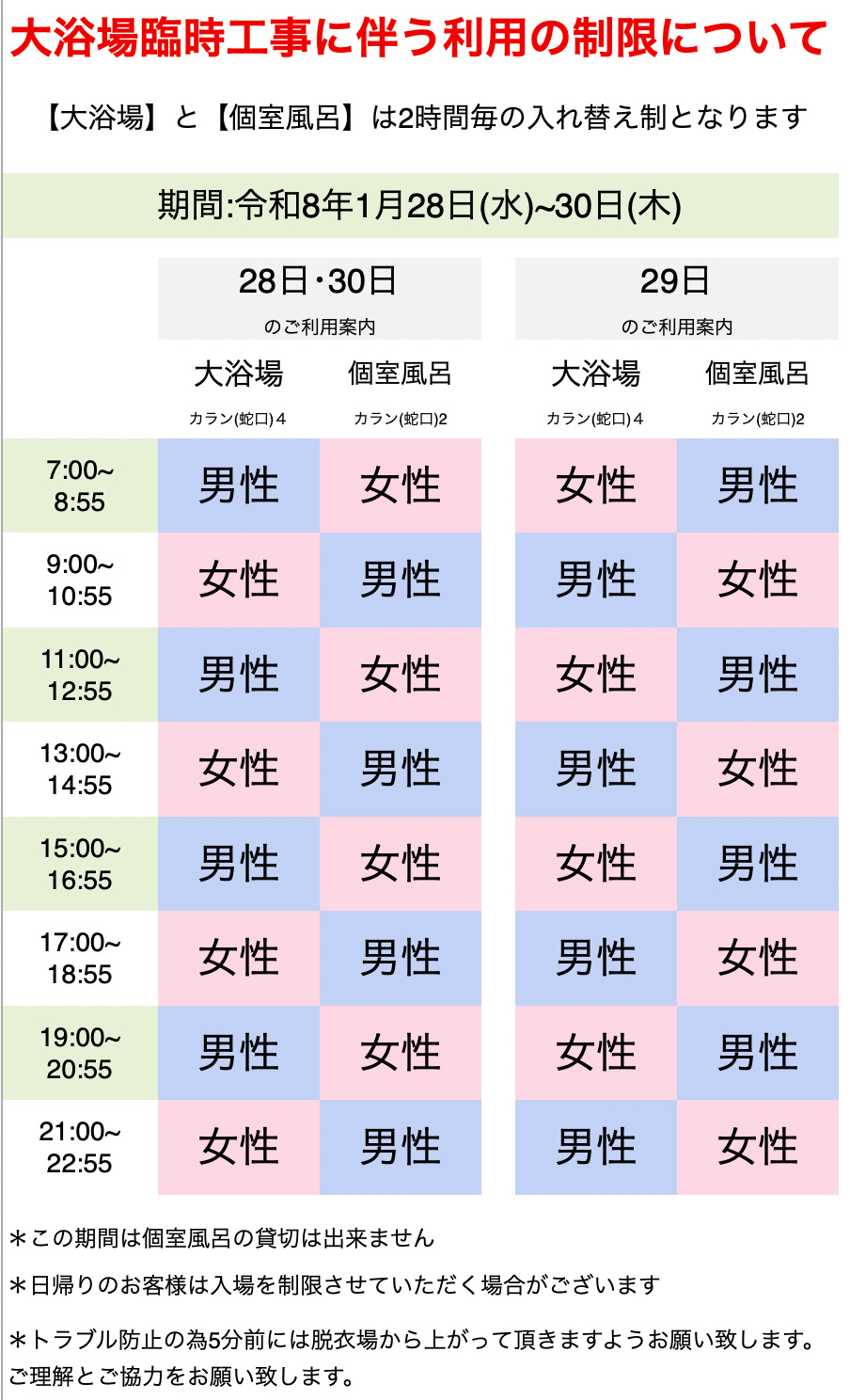 【大浴場臨時工事に伴う利用の制限について】